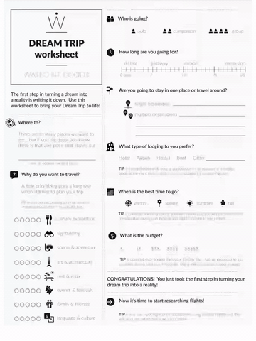 The Dream Trip Worksheet makes it easy to plan your next adventure!