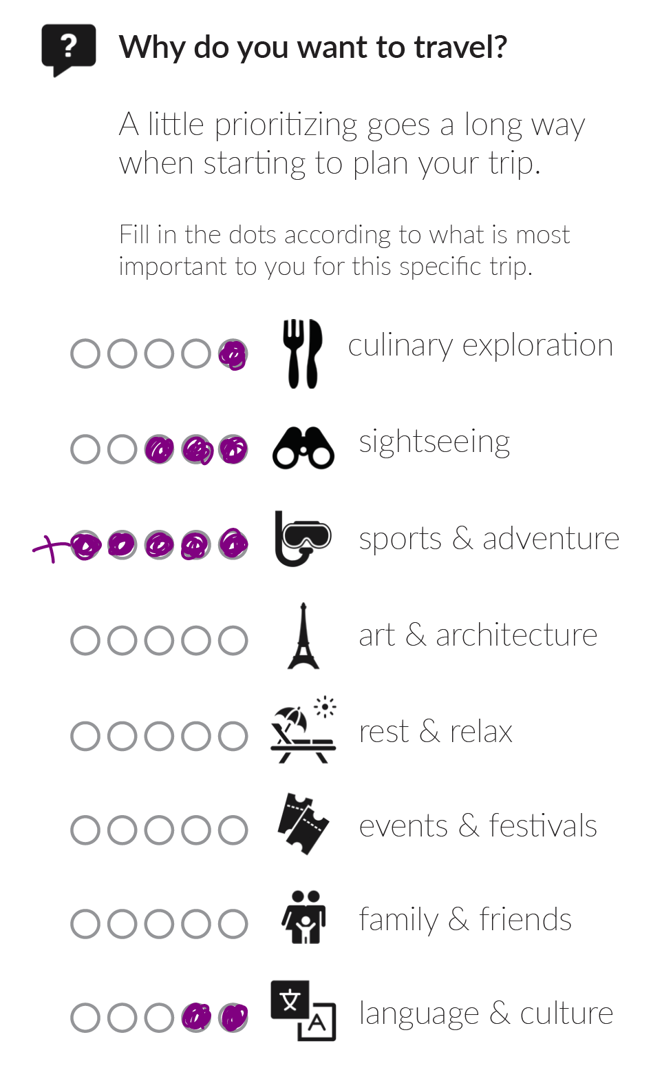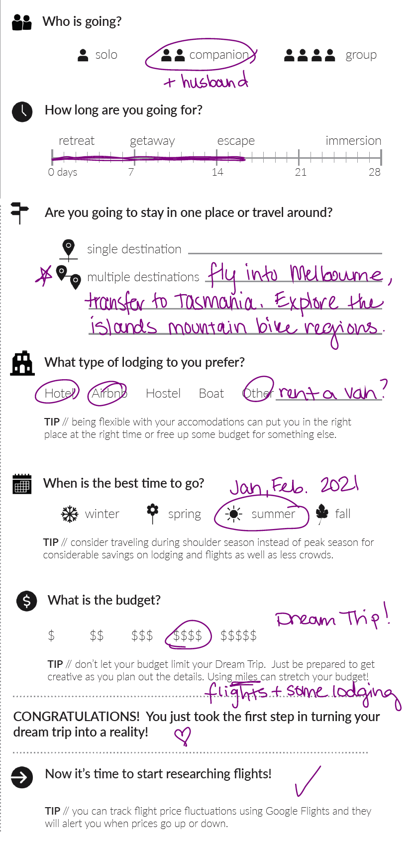 The rest of the questions help you sketch together a basic WHO, WHEN and HOW of the trip without getting too bogged down with details.